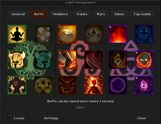 In the Buffs tab, you can view and activate available buffs, which provide advantages such as increased experience, regeneration, damage, among other benefits. Buffs are unlocked as the guild levels up.