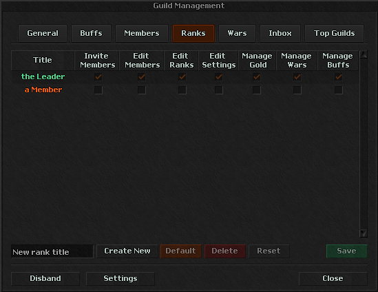 <figure><img src="https://1345368916-files.gitbook.io/~/files/v0/b/gitbook-x-prod.appspot.com/o/spaces%2F2N7QQbgWTnrvpmrc6VMD%2Fuploads%2FPMh0a0yhphaqXjEhTb5I%2Fguild5.png?alt=media&#x26;token=c6bcdea7-52f3-47f7-880d-35f5d37a97c9" alt=""><figcaption><p>Ranks</p></figcaption></figure>