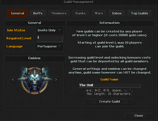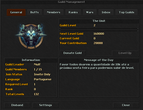 In the General tab, besides creating the guild, you can view general information such as level, current total gold and your contribution. Members can make donations, and leaders can adjust settings like required level to join the guild, message of the day and emblem.