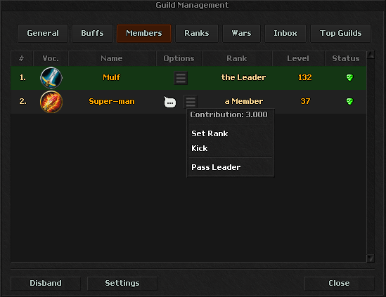 Additionally, there are shortcuts to send a message, remove from the guild, change the member's rank and use Exiva.