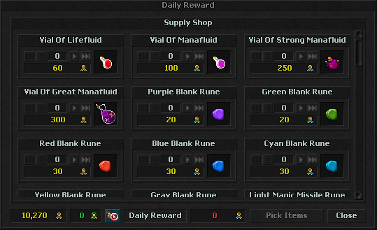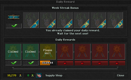 In Exordion, players have access to a system of D**aily Rewards**, which allows players to redeem points every day and exchange them for supplies in the **Supply Shop** of the module itself.