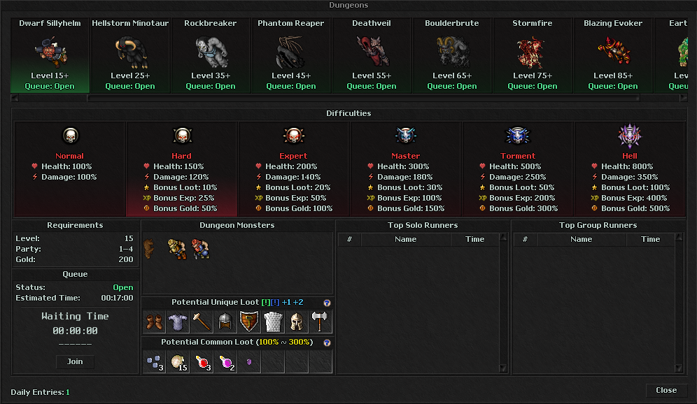 Each Dungeon has 6 difficulty levels, and to access the next difficulty level, the player must successfully complete the previous level. Difficulty levels vary in terms of monster health, monster damage, loot bonus, experience and gold.