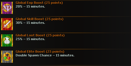 Buffs that, when purchased, **benefit the entire server** with temporary boosts, such as: