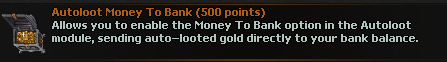 In the [Autoloot](https://exordion.gitbook.io/exordion-wiki/en/client/auto-loot)module, you can enable the "Money To Bank" option, automatically sending collected gold directly to the player's bank balance.