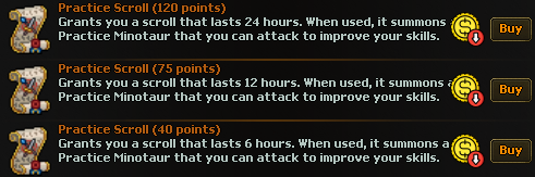 Item that summons a **Practice Minotaur (training dummy)** to assist in skill training.